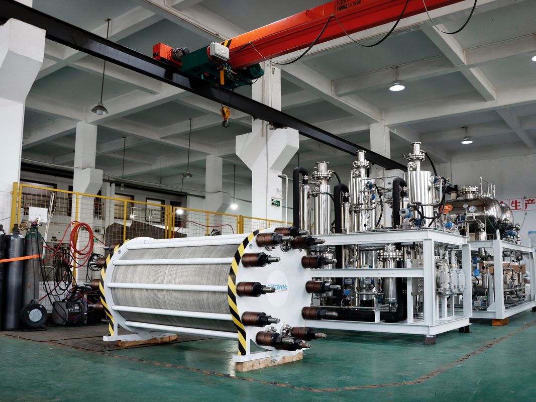 O hidrogénio produzido é então processado através de sistemas de separação gás-líquido, purificação e secagem para alcançar o nível de pureza necessário.